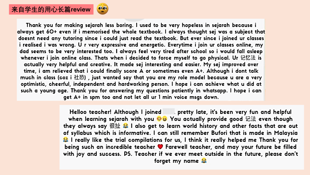 曾受邀于SMK Bagan Jaya 和 SMK Cheras Perdana 主讲《SPM 历史答题技巧讲座》 - Each year, has led students to achieve excellent results — over 85% scoring an A in SPM History, with an overall pass rate exceeding 98%.